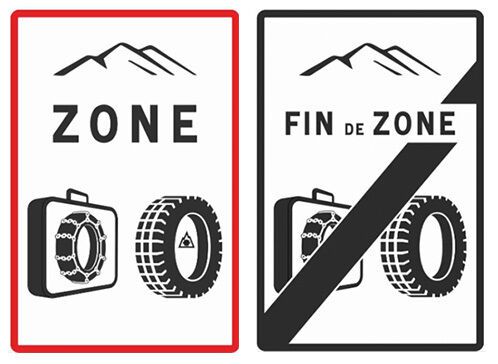 Mit dieser neuen Vorschrift wurden zwei neue Strassenschilder eingeführt. Die Schilder B58 und B59 weisen auf die Gebiete hin, in denen die Ausrüstung obligatorisch ist. B58 zeigt einen Schneereifen (mit dem Schneeflocken-Logo) und einen Schneekettenkasten mit einem Berg darüber in einem roten Rahmen. Es zeigt die Einreise in ein betroffenes Gebiet und kann mit den Daten der Anwendung (vom 1. November bis zum 31. März) oder dem Vermerk „Erinnerung“ versehen sein. B59 hat die gleichen Symbole, ist aber mit einer schwarzen Linie durchgestrichen und zeigt das Ende des von der Verpflichtung betroffenen Gebiets an.